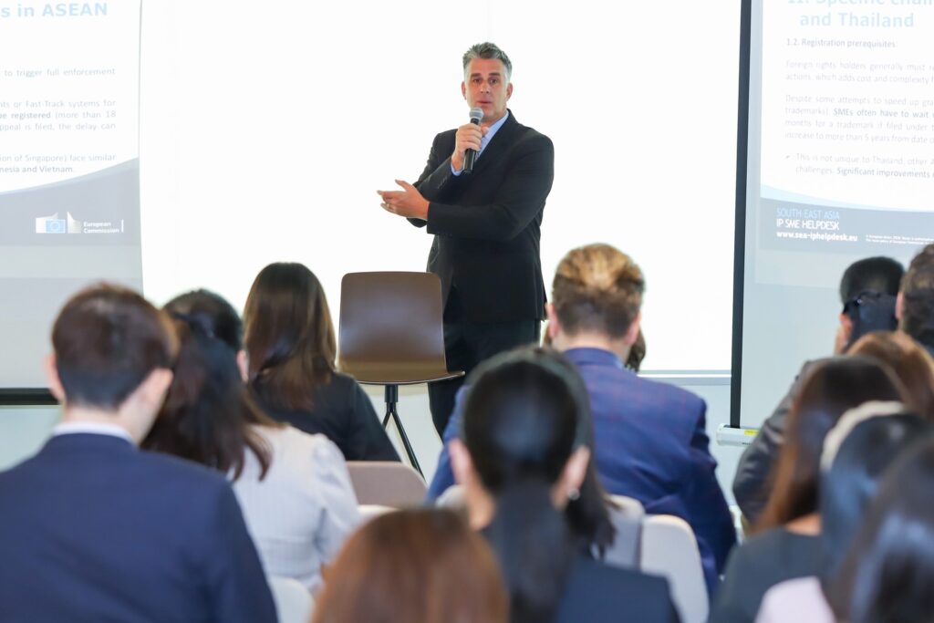 ภายในงานสัมมนาซึ่งนำโดย นางสาวภาวิณี บุนยะมิศร์ ประธานคณะทำงานด้านการคุ้มครองทรัพย์สินทางปัญญา สมาคมการค้ายูโรเปียนเพื่อธุรกิจและการพาณิชย์ (EABC) พร้อมด้วยผู้เชี่ยวชาญจาก SEA IP SME Helpdesk, กรมศุลกากร, กองบังคับการปราบปรามการกระทำความผิดเกี่ยวกับอาชญากรรมทางเศรษฐกิจ (บก.ปอศ.), กองป้องปรามการละเมิดทรัพย์สินทางปัญญา กรมทรัพย์สินทางปัญญา, และผู้แทนจากแพลตฟอร์มอีคอมเมิร์ซชั้นนำอย่าง Lazada และ Alibaba ร่วมสะท้อนภาพรวมภูมิทัศน์การบังคับใช้กฎหมายทรัพย์สินทางปัญญาและการปราบปรามสินค้าผิดกฎหมายในประเทศไทย และแลกเปลี่ยนแนวปฏิบัติที่ดีจากยุโรปและอาเซียน รวมถึงบทบาทภาคธุรกิจในการร่วมมือกับภาครัฐเพื่อส่งเสริมการป้องกันและปราบปรามการค้าผิดกฎหมาย พร้อมเผยแพร่เอกสารเปิดผนึก “ข้อเสนอ เพื่อการแก้ไขและจัดการปัญหาการค้าผิดกฎหมายในประเทศไทย” ซึ่งจัดทำโดย EABC ระบุถึงสถานการณ์การค้าผิดกฎหมาย ผลกระทบ และข้อเสนอแนะแนวทางแก้ไข ภายใต้การบูรณาการความร่วมมือระหว่างผู้มีส่วนได้ส่วนเสีย ส่งเสริมให้ผู้ประกอบการในทุกระดับและจากทุกประเทศ โดยเฉพาะระดับวิสาหกิจขนาดกลางและขนาดย่อมให้ได้รับการคุ้มครองด้านทรัพย์สินทางปัญญาและจากการค้าสินค้าผิดกฎหมาย การยกระดับกฎระเบียบให้สอดคล้องกับมาตรฐานสากล เพิ่มความสามารถในการแข่งขันและความมั่นคงทางเศรษฐกิจของประเทศไทยในระยะยาว สอดรับยุทธศาสตร์ชาติ