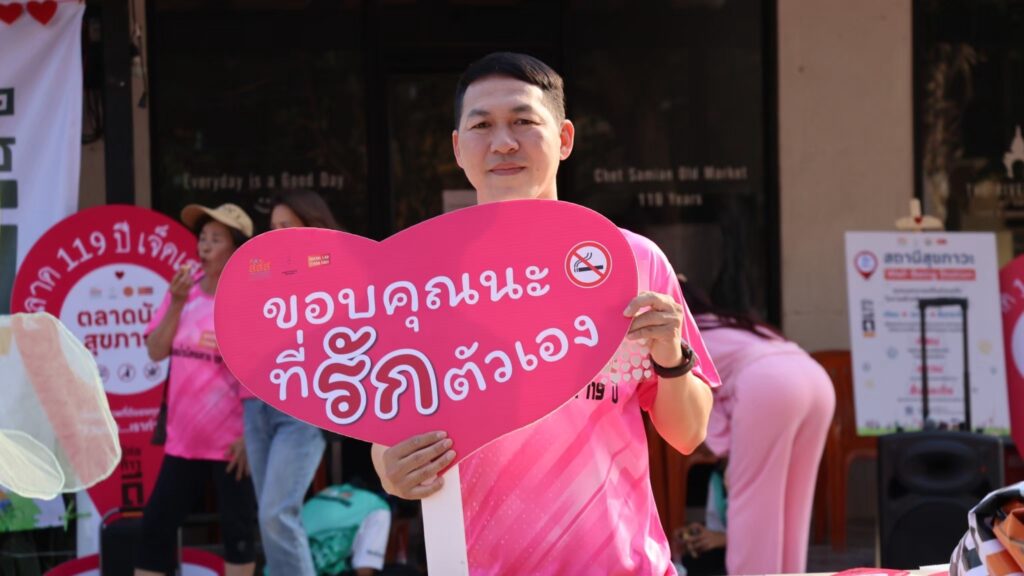2. จากครอบครัวสู่ชุมชน: พลังของการอยู่ร่วมกันอย่างมีสุขภาวะ “ เมื่อครอบครัวสุขภาวะหลายครอบครัวมารวมกัน ชุมชนสุขภาวะก็จะเริ่มก่อร่างขึ้น ชุมชนสุขภาวะไม่จำเป็นต้องเริ่มจากโครงการใหญ่ แต่อาจเริ่มจากสิ่งเล็กๆ เช่น การตั้งกติกาชุมชนปลอดเหล้า บุหรี่ และยาเสพติด การเปิดพื้นที่สาธารณะปลอดภัยสำหรับเด็ก และผู้สูงอายุ การจัดตลาดสุขภาวะ ตลาดที่ปราศจากปัจจัยเสี่ยงทางสุขภาพ เช่นที่ตำบลเจ็ดเสมียน ที่คนในชุมชนได้ประกาศให้ ตลาด 119 ปี เป็นตลาดสุขภาวะ ไร้ควันบุหรี่ สิ่งเหล่านี้ช่วยสร้าง *ข้อตกลงร่วม* ที่คนในชุมชนรู้สึกเป็นเจ้าของ และทำให้สุขภาวะ กลายเป็นเรื่องของทุกคน ไม่ใช่หน้าที่ของใครคนใดคนหนึ่ง เพราะเมื่อชุมชนดูแลกันเองได้ ความสุขจะเติบโตได้เองโดยไม่ต้องสั่ง”